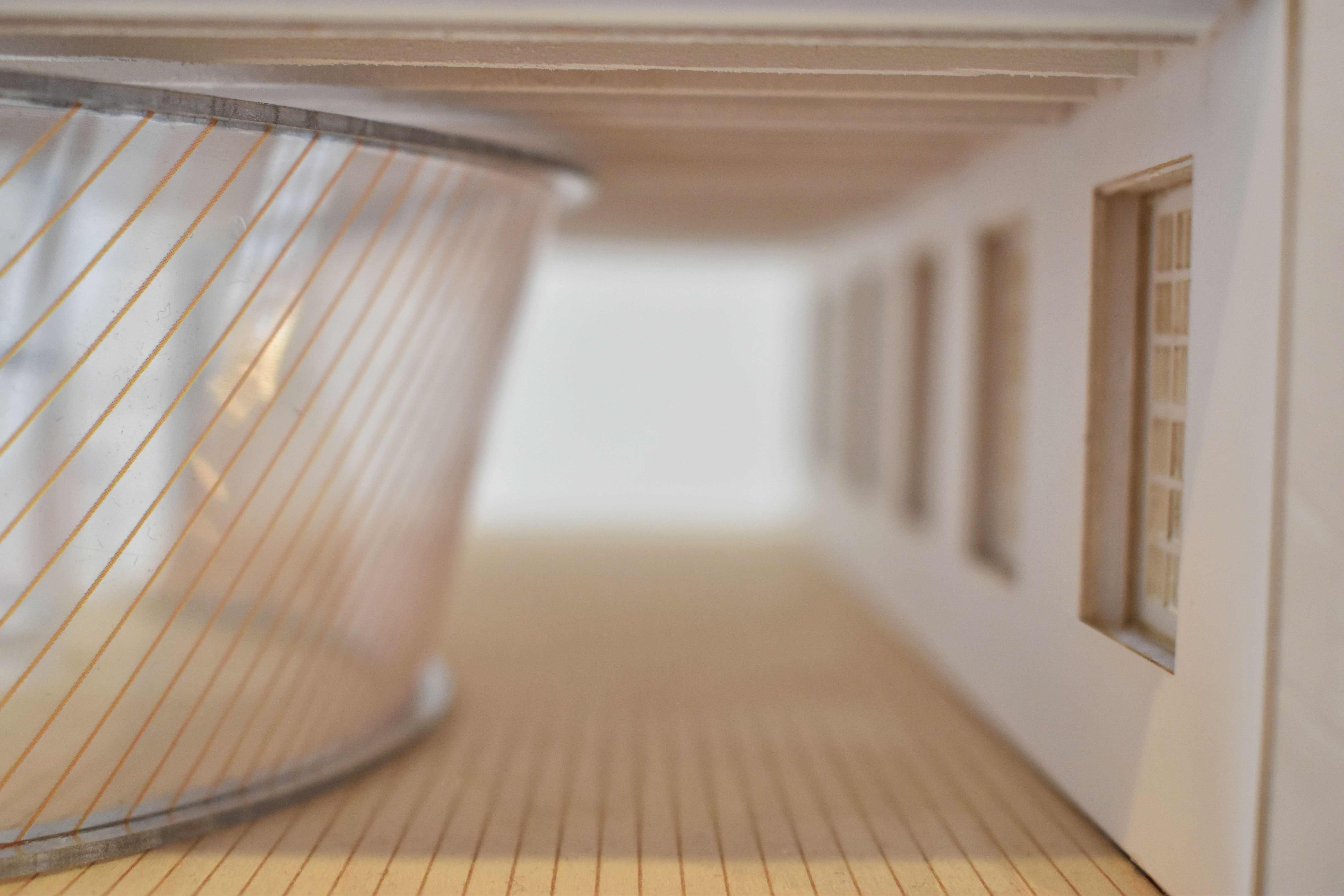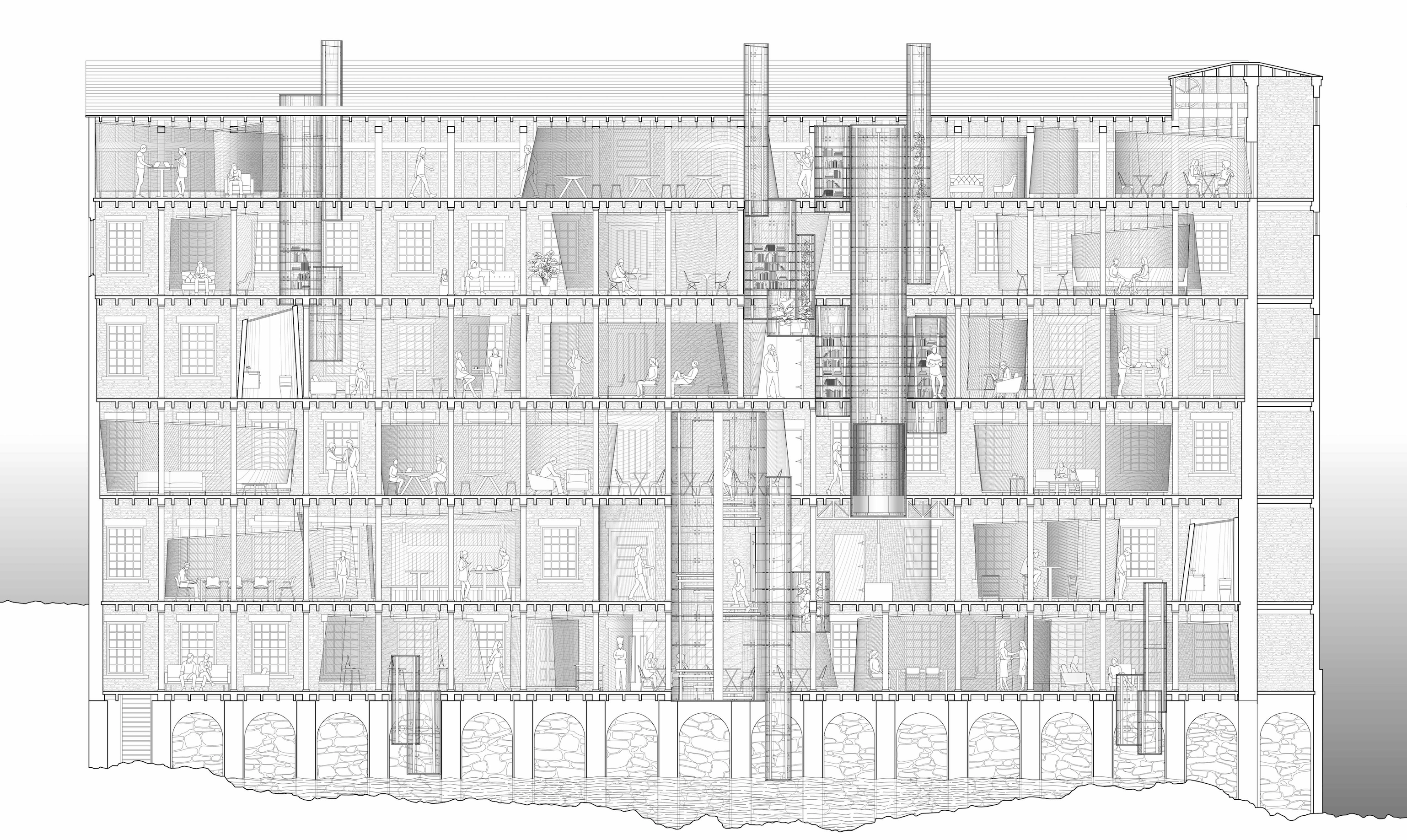 A series of glass conical forms cut against the horizontal grain of the mill building at its core, providing circulation space that runs parallel to a vertical library of manuals, textile patterns and recipe books. The composition of these glass forms facilitates bridging social capital, encouraging connections between groups through both observation and physical interaction. Transparent fabric ellipsoids grow from the glass core, dilineating soft boundaries for small markets and job training classrooms. The intersection of two movable fabric forms provides a hybrid, third space. These fabric forms are moveable and adaptable, allowing inhabitants to continuously redefine boundaries of space.